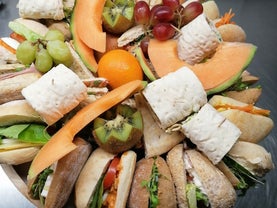 1 wrap met mix van luxe en standaardbeleg & verse groentjes + 1 stuk vikingbrood (met serranoham, rode tapenade en/of Loonse Stroop, philadelphia & rucola) per persoon